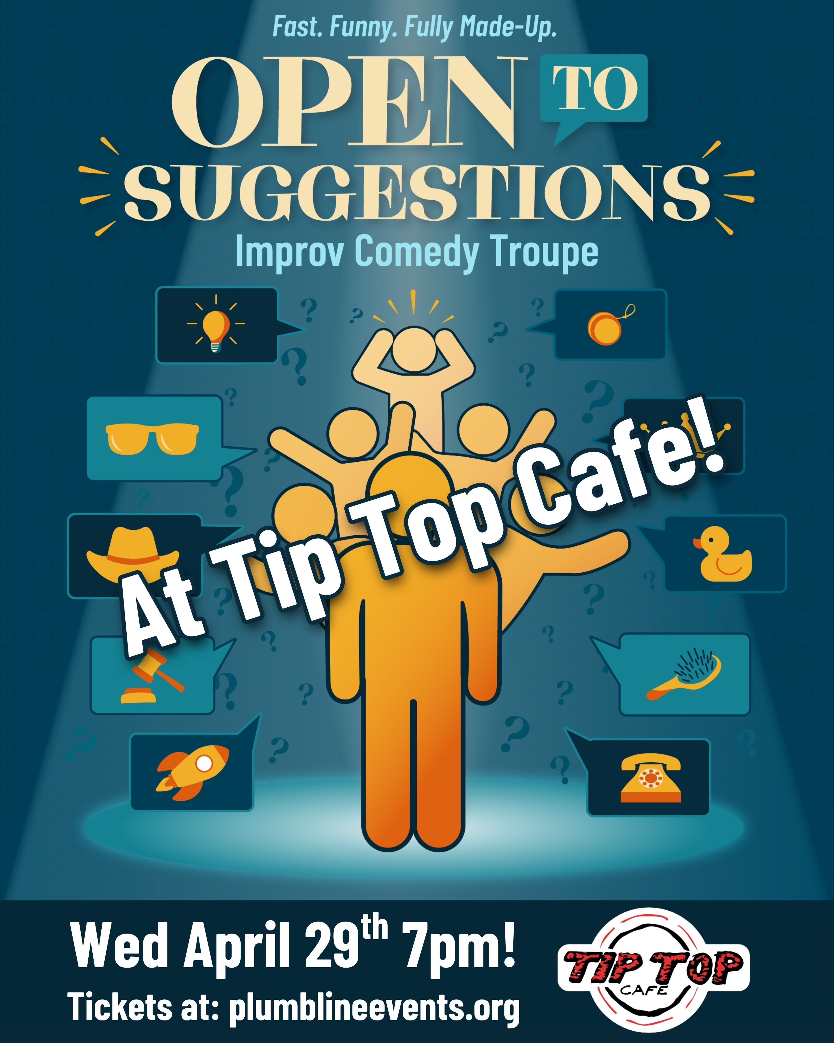 Come give us your suggestions for this fast-paced, interactive, Huntsville original improv comedy show! No two shows are alike, everything is made up, and it’s always a good time. Tickets at https://www.plumblineevents.org/event-details-registration/open-to-suggestions-tiptopcafe-apr-29-1